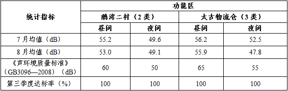 盐田区共有鹏湾二村、太古物流仓两个功能区噪声监测点位,鹏湾二村为2类功能区,太古物流仓为3类功能区。根据功能区噪声监测数据结果,2019年第三季度鹏湾二村、太古物流仓昼间和夜间噪声值均达到功能区标准,达标率为100%。