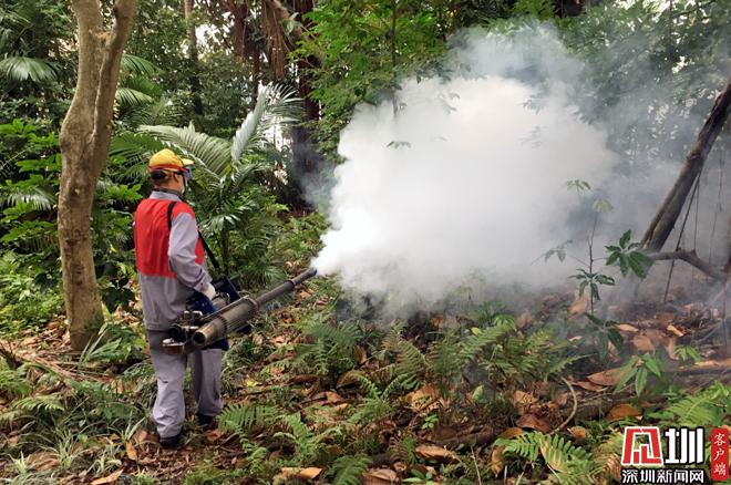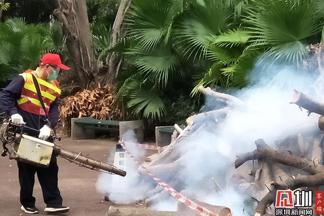 记者在海山街道鹏湾社区鹏湾一村内看到,消杀工人正使用烟雾机对社区公园内的绿化带开展成蚊烟雾薰杀,对下水井进行蟑螂灭杀。他们还使用小型手动式喷雾器对阴暗角落、垃圾桶进行进行悬浮剂药物滞留喷洒,灭杀成蚊、成蝇。“喷洒烟雾药剂可对蚊蝇、蟑螂产生触杀作用,喷洒悬浮剂则通过药物滞留形成较长时间的消杀作用,二者结合可有实现更加彻底的消杀效果。”正在消毒作业的工人向记者表示。