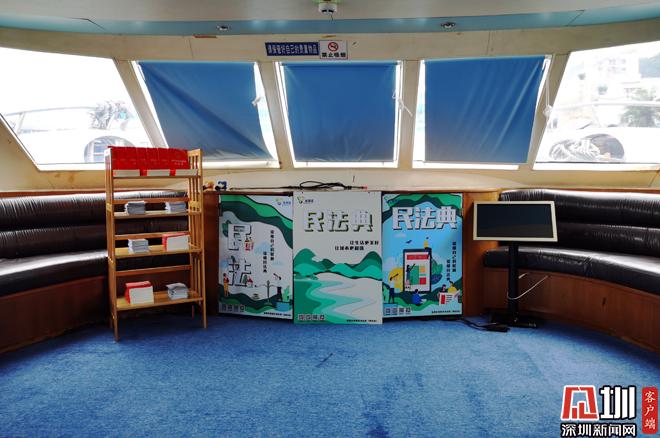 在最新打造的“民法卫士号”游船上,盐田区普法办专门开辟一块区域作为民法典宣传角,市民游客在欣赏盐田美好风光的同时可接受民法精神的熏陶。