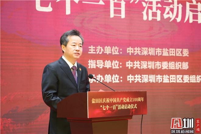 见圳客户端·深圳新闻网讯(记者 陈琳君 李小辉)2021年3月3日,盐田区庆祝中国共产党成立100周年“七个一百”活动启动仪式在区党群服务中心举行。据悉,为庆祝建党100周年,盐田区将围绕“四史”教育,组织开展庆祝“七个一百”特色活动,进一步激发全区党员干部的爱党爱国热情,凝聚推动盐田改革发展的强大动力,为高质量全面建成宜居宜业宜游的现代化国际化创新型滨海城区提供坚强保证。区委书记陈清、区领导乔智、乔宏彬、谷云宏、郝建勇、袁虎勇参加启动仪式,市委组织部组织三处处长冀小平到会指导。