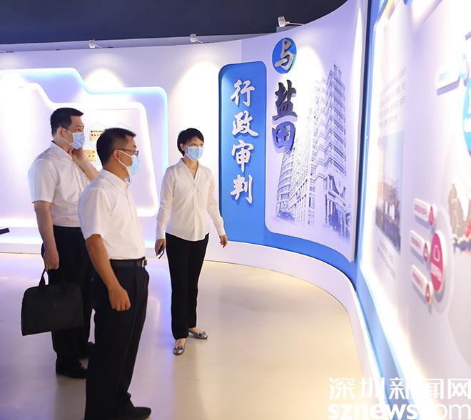 谷云宏一行参观了深圳行政审判中心自助立案区、诉讼服务中心、文书驿站、行政纠纷化解工作室、行政法律文化区、数字法庭等,听取了盐田区人民法院关于党建、审判执行、司法改革、队伍建设等工作情况的介绍,对工作中存在的问题和困难进行了交流,并提出指导性意见建议。