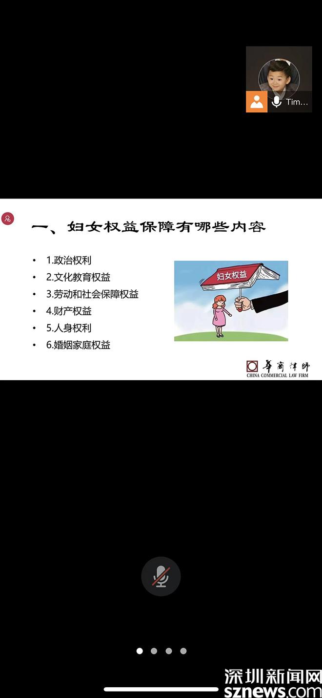本次讲座以线上的形式举行。讲座中,陈升杰简要介绍了妇女权益保障的主要内容,并选取了“财产权益”“人身权利”“婚姻家庭权益”等与社区妇女息息相关的内容,结合相关法律规定、法理以及案例,深入浅出地分享了妇女享有哪些权利,妇女应该如何保障自己的权益,以及妇联、社区等社会组织应当如何履行保障妇女权益的职责等内容。