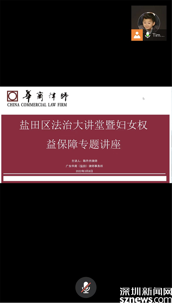 读特客户端•深圳新闻网2022年3月9日讯(记者 邓雪婷 通讯员 程君婷 肖静怡)为提升中英街辖区居民知法、懂法、用法的能力,积极营造关爱妇女氛围,3月8日,中英街管理局举办盐田区法治大讲堂暨妇女权益保障专题讲座,邀请了社区法律顾问广东华商(盐田)律师事务所陈升杰律师为辖区居民分享与妇女权益保障有关的法律知识。