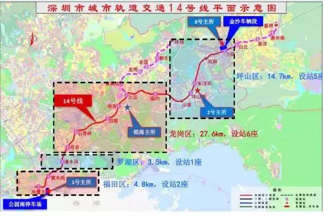 深圳段和惠州段都将于2017年开工,2022年左右开通。14号地铁线深圳段规划站点:岗厦北——黄木岗——清水河——布吉——石芽岭——四联——坳背——大运——南约——沙湖——朱洋坑——坑梓——沙田;