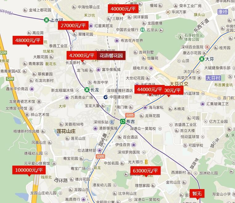 布吉站为3、5、14号线的换乘站。14号线车站沿龙岗大道南北向敷设,车站为地下三层岛式车站。南邻深圳经济特区腹心地带罗湖区,距离深圳市中心4公里,周边新一佳超市,天虹超市,附近有铁路市场。购物方便,加之2万宽市政绿化广场,东临深惠公路,西临布吉中心区规划新区,北赏石芽岭秀丽景色;具有十分出众的自然以及人文资源。 新房价格在4.2万-6.3万元/平之间;二手房价格在2.9万-4.4万元/平的区间。