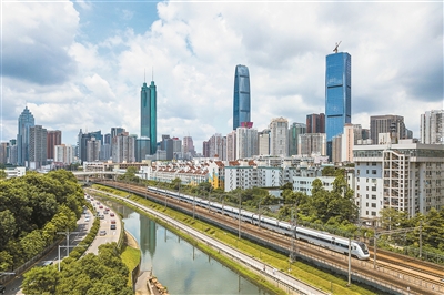 从高空俯瞰广深铁路罗湖段布吉河畔,景观优美、绿色宜人。 深圳特区报记者 刘羽洁 摄