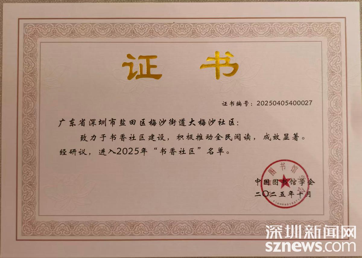 大梅沙社区入选中国图书馆学会“书香社区”。
