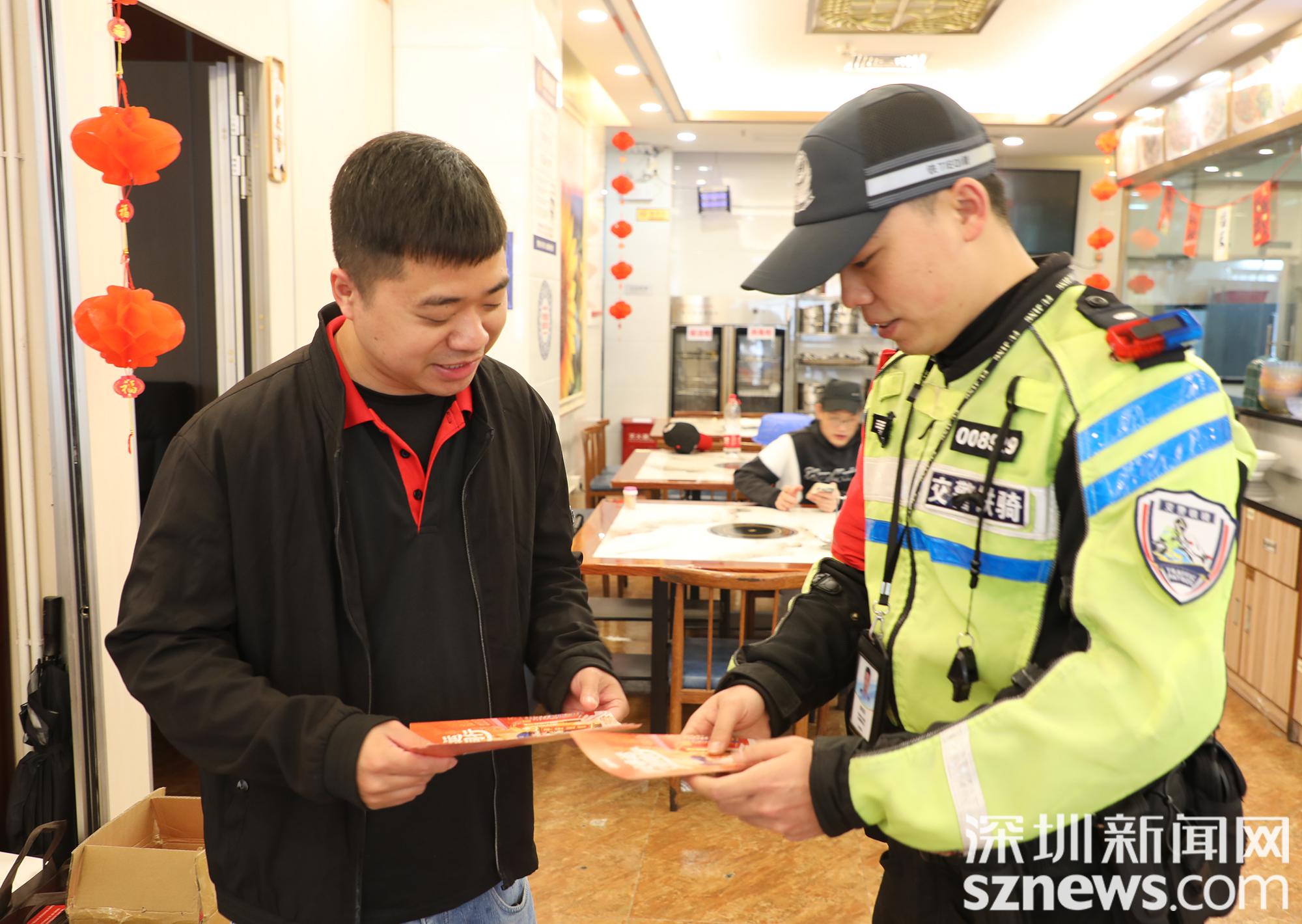 深圳新闻网2026年2月10日讯 随着春节临近,各类聚餐活动增多,酒驾醉驾风险随之攀升。为从源头预防涉酒交通事故,保障节日期间道路交通安全有序,2月10日,深圳市公安局交通管理支队盐田大队主动作为,组织警力深入辖区多家酒店、餐厅等餐饮场所,开展以“拒绝酒驾,平安过年”为主题的精准宣传活动。