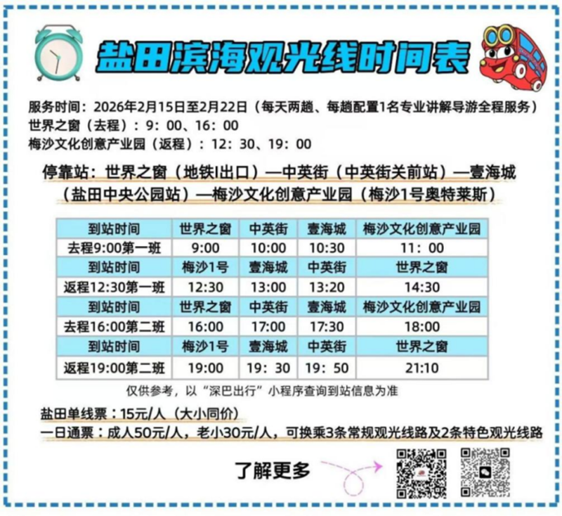 一步一景、一路皆景。该专线不仅是一条看海线,更是一条精心设计的“新春游玩动线”。整条线路巧妙地将世界之窗、中英街、壹海城、梅沙湖等深圳东西部的核心景点与潮流商圈“串珠成链”,真正实现城市地标与滨海景点的高效接驳,让市民游客在流动的风景中畅游山海、欢喜过大年。