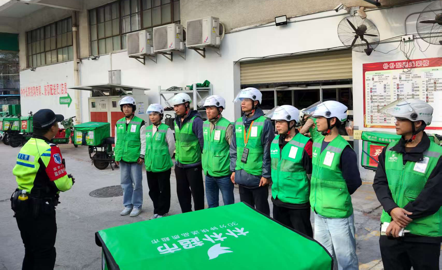 宣传员围绕 “一盔一带” 安全守护、非机动车通行规定、恶劣天气安全骑行技巧、事故应急处置等内容开展讲解,叮嘱骑手规范停放车辆、礼让行人,做到接单再忙,安全不忘。同时,宣传员与站点负责人沟通交流,督促企业落实交通安全主体责任,加强骑手日常安全教育与车辆管理,从源头防范安全风险。