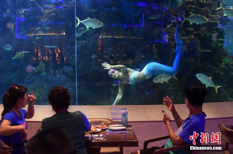 6月14日,厦门环岛路的一海洋文化主题餐厅,食客边吃边看“美人鱼”的水上表演。据了解,该餐厅是一家以海洋文化为主题的餐厅,餐厅内有直径9米的圆柱型水体及长达80米的海洋观景带,观景玻璃后面就是真实的海底世界景色,上百种海洋生物在其中徜徉。此外,餐厅还特邀俄罗斯专业芭蕾舞者,在水中翩然起舞,以柔美舞姿为来宾带来难忘的视觉盛宴。图为顾客在餐厅边用餐边看表演。吕明 摄